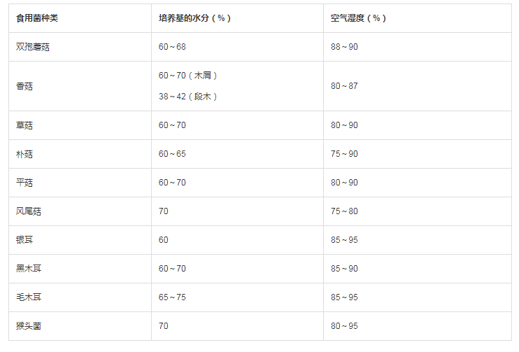 ? ? ? ? 以下是一些食用菌對培養(yǎng)基的水分和空氣濕度的要求: